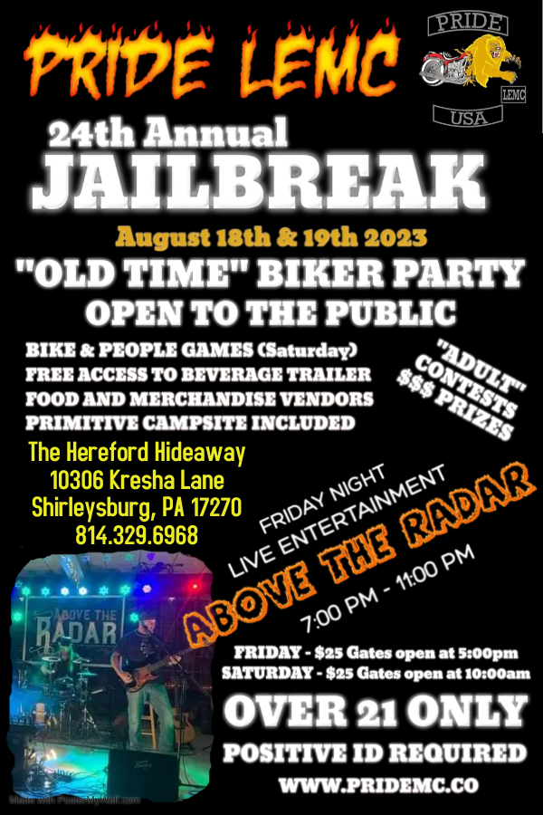 Jailbreak is an “Old Time” style biker party. An entire weekend of good fun, good friends, food, entertainment, bike and people games, adult beverages, debauchery, and shenanigans!